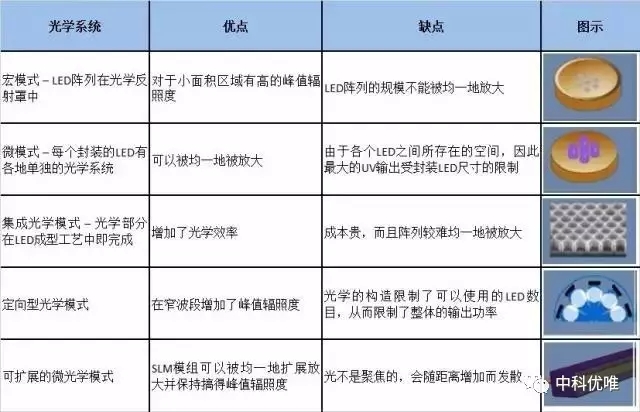 UV LED光源的效能。對(duì)于UV LED供應(yīng)商所采用的幾種典型光學(xué)方法及其優(yōu)缺點(diǎn)的匯總見(jiàn)下表。