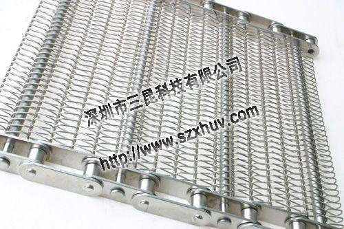10.鏈條式網帶:由鏈條驅動的輸送網帶一般都由鏈條帶動小軸再帶動網帶運行。 網帶都采用軋牙串條、左右網條二根串,并大小網條連接而成,大網條內穿進小軸,小軸二端穿入鏈條孔,從而達到鏈條驅動輸送網帶。鏈條網傳動平穩、傳動力矩小。11,U型鏈條網帶,也可作為螺旋式網帶,采用進口電腦網帶機生產,網面強硬耐用,不易變形。最大特點是轉彎性能好,可以實現180度的轉彎,且運行平穩。具有網面平整,可承載較重的壓力和拉力。通風透氣性能好,網面潔凈無毒,而且容易清洗。維修和拆卸極為方便。可根據客戶要求在網帶兩側加裝擋邊。